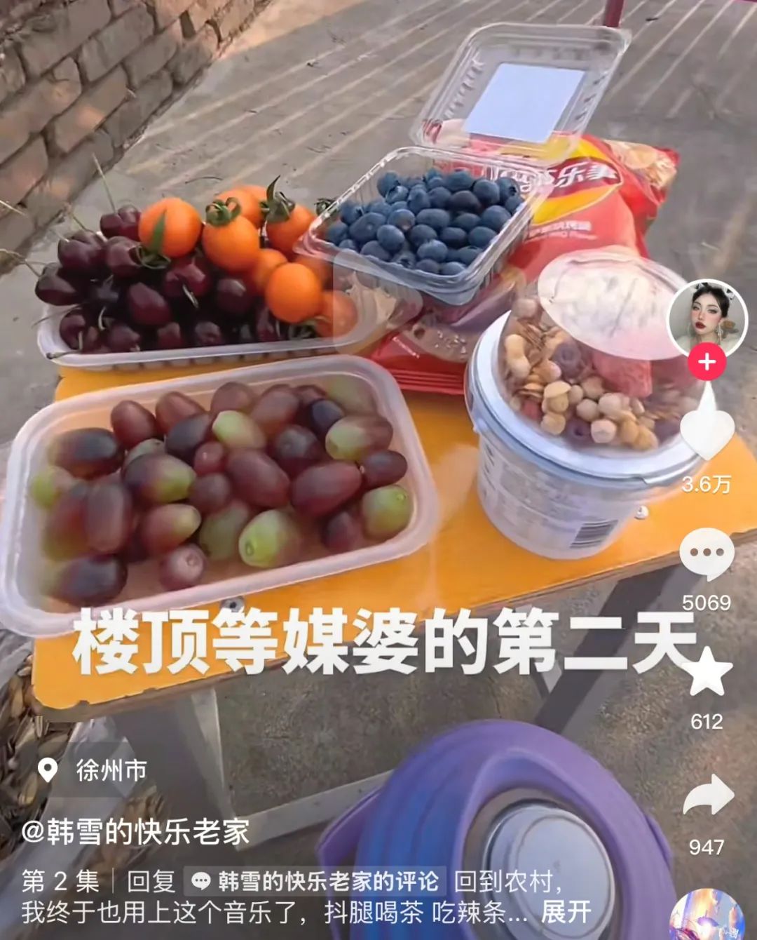 2023年春節,一位滬漂女孩早早回到農村老家過年。在一個晴朗的早上,她在老家房頂擺上一張小桌子,放滿了草莓、車釐子、葡萄等水果,悠哉地翹着腿享受,那時,她隨手拍了一條視頻記錄美好生活。