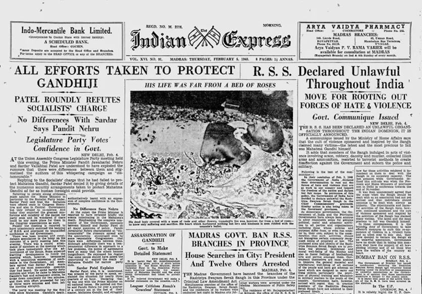 1948年,RSS成員納圖拉姆·戈德塞刺殺聖雄甘地後,該組織被取締直至1949年。圖源:《大篷車》