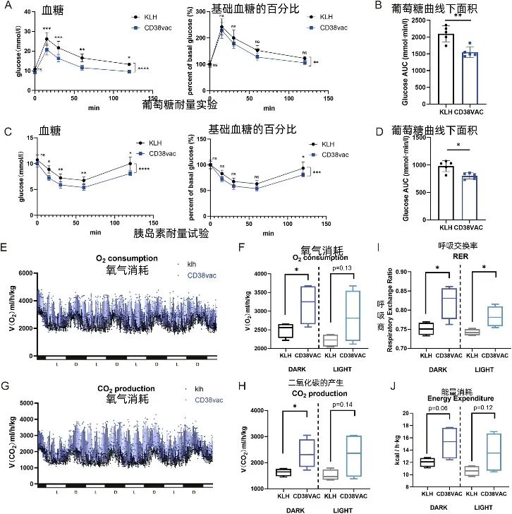 並且,接種CD38疫苗的小鼠的葡萄糖耐受和胰島素敏感性都顯著提高了,氧氣消耗和整體能量代謝水平也增強了。所以,“中年發福”以及血糖失控等代謝問題也得到了改善。