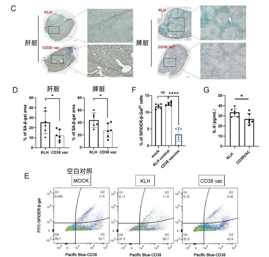 圖注:CD38肽疫苗使自然衰老小鼠組織中的衰老細胞、相關因子減少