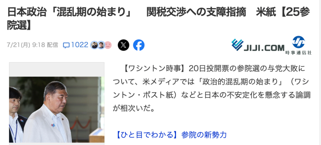 歐美媒體集體唱衰“日本開啓政壇大混鬥時期”。他們認為,因自民黨陷入毀滅性大慘敗,其政權基礎被削弱,加深日本政治不穩定因素,從而對毫無進展的日美關税談判造成不良影響。