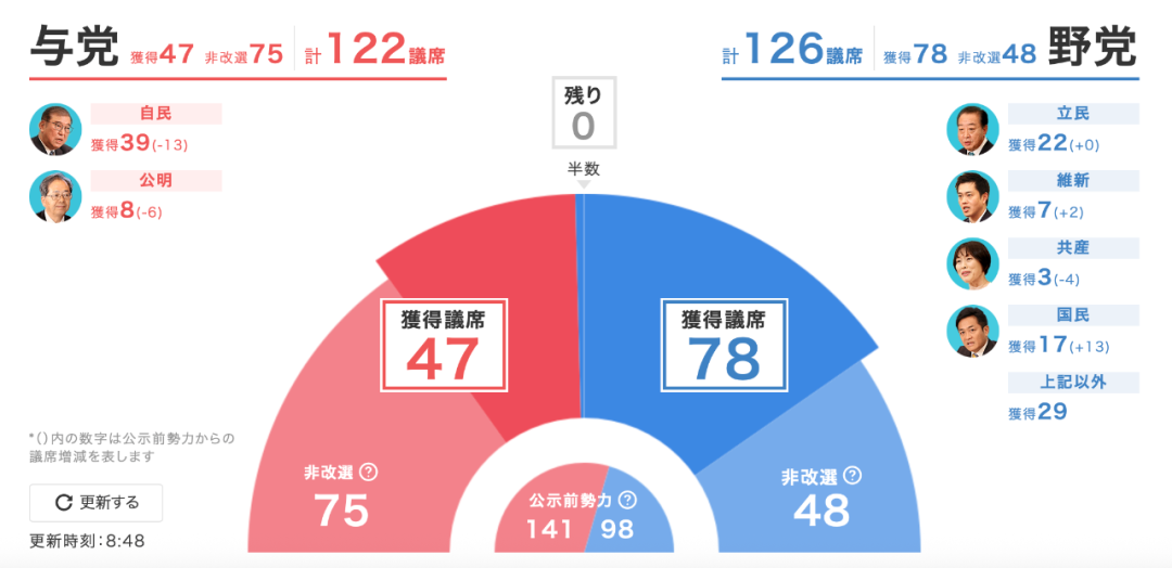 然而現實給予石破茂沉重一擊,執政聯盟最終僅獲47個席位,加上在非改選中的75席,在參議院僅獲得122席。