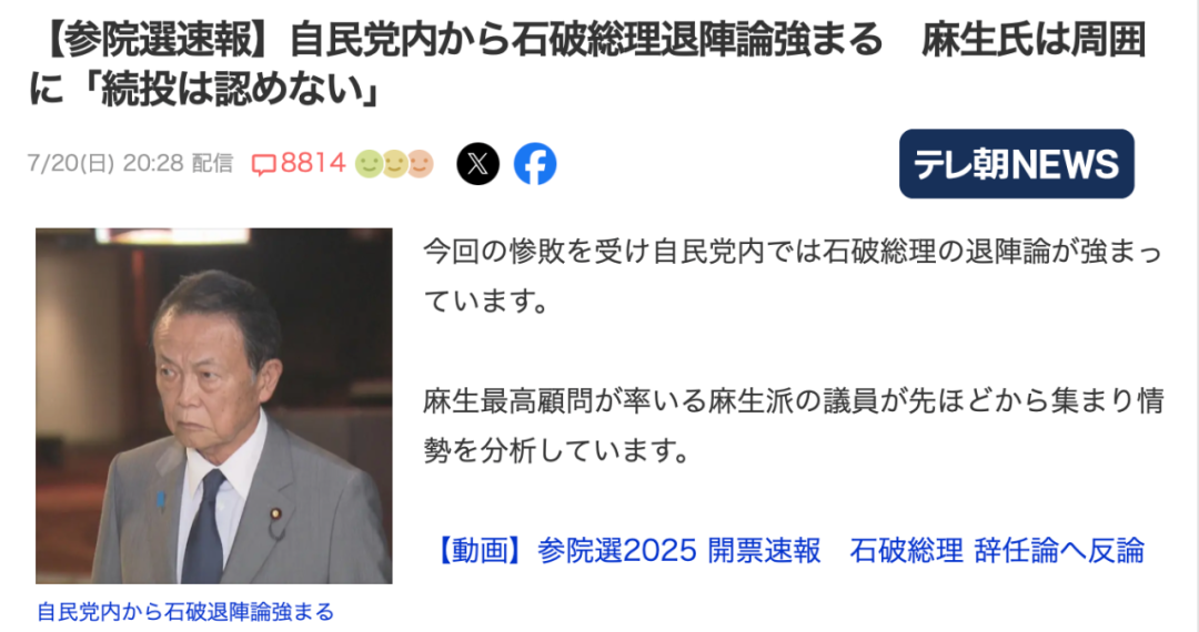 此次參議院大慘敗,對於麻生太郎而言,自然是拉石破茂下台的絕佳時機。