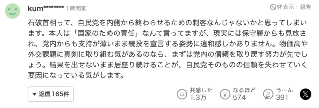 有日本網友認為,石破茂就是自民黨的終結者,不僅在現實中被保守派拋棄,在黨內也是獨行者,支持不足。如果他有認真應對高物價以及展示優秀的外交手腕的話,那麼或許會挽回支持率。
