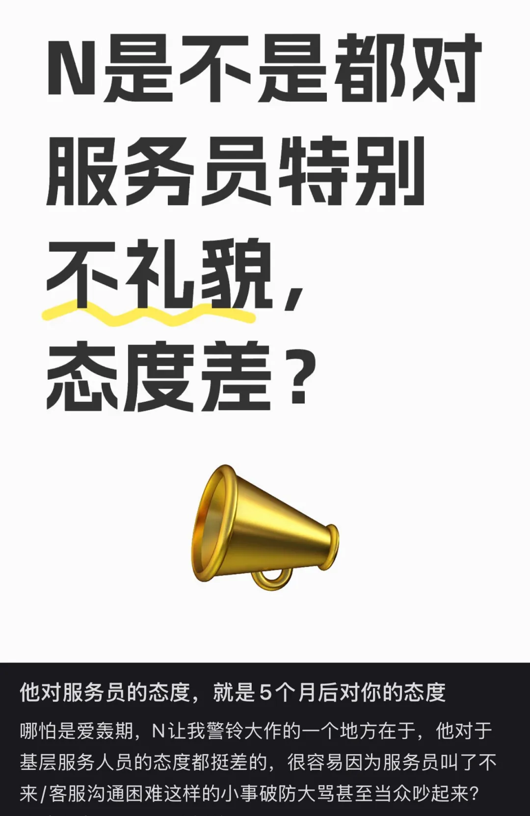 還有朋友反映,相處期間温柔穩定的對象跟超市櫃員説話的時候,居然表現出自己從來沒見過的惡劣樣子。