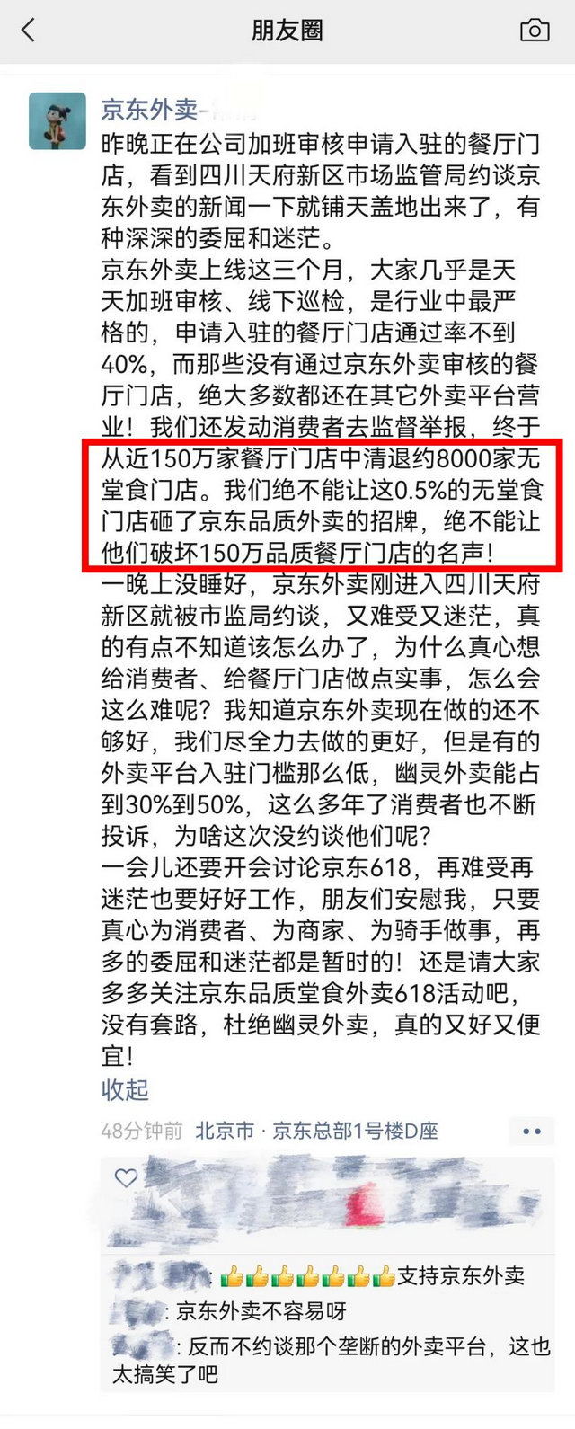 為了做到這一點,據傳京東外賣團隊天天加班審核、線下巡檢,申請入駐的餐廳門店通過率不到40%,此前已從近150萬家餐廳中清退了約8000家無堂食門店。