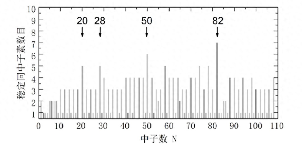 圖 在穩定同中子素的數量統計中,幻數位置的數量明顯突出。圖源| 《原子核物理》 盧希庭主編