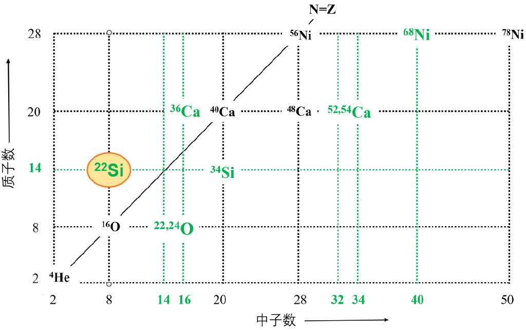 硅-22也是一個新質子幻數14的候選者。已有研究證實,在硅-22(Z=14,N=8)的鏡像核——擁有傳統質子幻數8的氧-22(Z=8,N=14)中,中子數14具有“幻數”特徵,因此氧-22是一個雙幻核。由於鏡像核之間的對稱性,在硅-22中,質子數14理論上也應該是一個新“幻數”,即硅-22也應該是一個雙幻核!