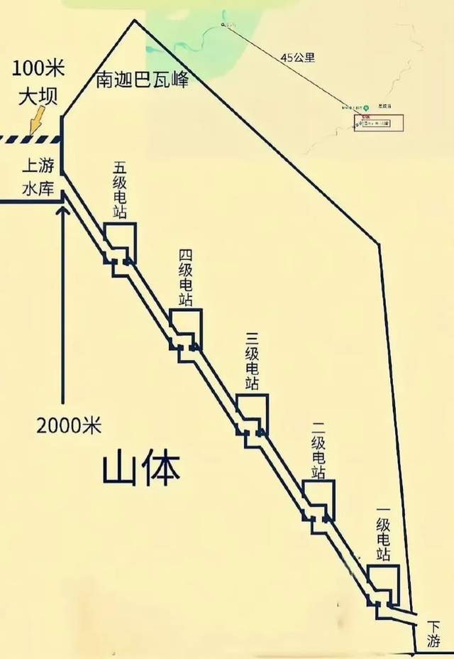因此,在綜合考慮多方因素之後,採用了“截彎取直+隧洞引水+5個階梯電站”模式。這就類似於是雅礱江上的錦屏一級,錦屏二級水電站。在雅礱江上游修建低壩攔水,經過引水隧道發電,到下游釋放水源。