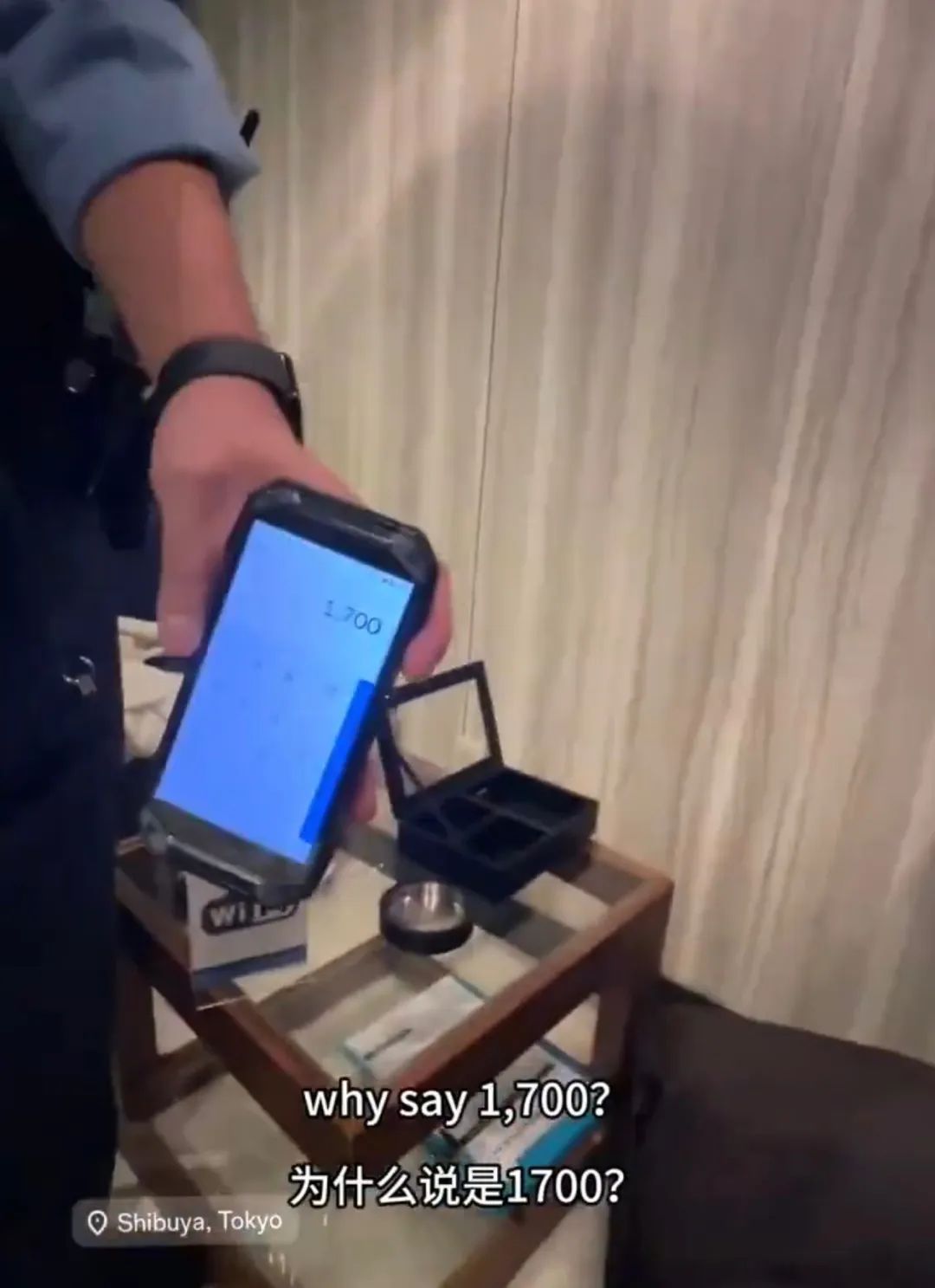 男子全程用英語質問:“我是被捕了嗎?為什麼要檢查我的護照?”警察看似聽不懂,只拿着手機打字,顯示“半小時1700日元”。