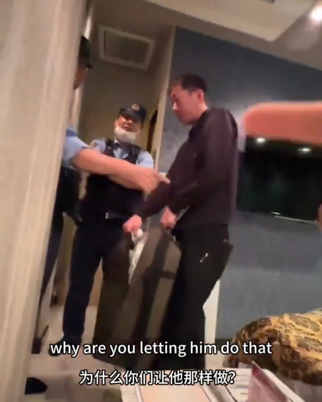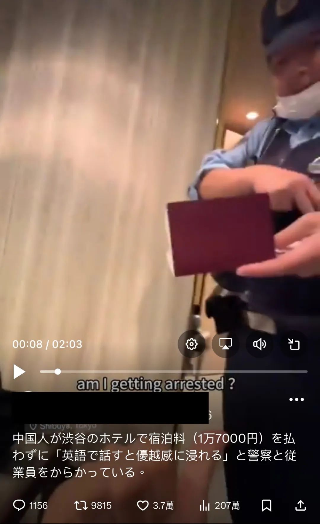 視頻拍攝於澀谷一家酒店大堂,一名亞洲面孔男子因不滿房費多收與店方爭執,隨後被叫來的日本警察要求出示護照。