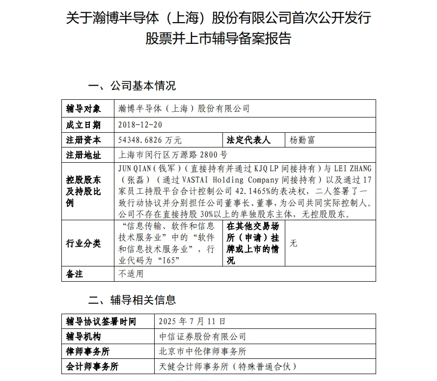 中國證監會官網顯示,瀚博半導體(上海)股份有限公司已啓動上市輔導,由中信證券擔任輔導機構。輔導備案報告顯示,JUN QIAN(錢軍)(直接持有並通過KJQ LP間接持有)與LEI ZHANG(張磊)(通過VASTAI Holding Company間接持有)以及通過17家員工持股平台合計控制公司42.1465%的表決權,二人簽署了一致行動協議並分別擔任公司董事長、董事,為公司共同實際控制人。公司不存在直接持股30%以上的單獨股東主體,無控股股東。