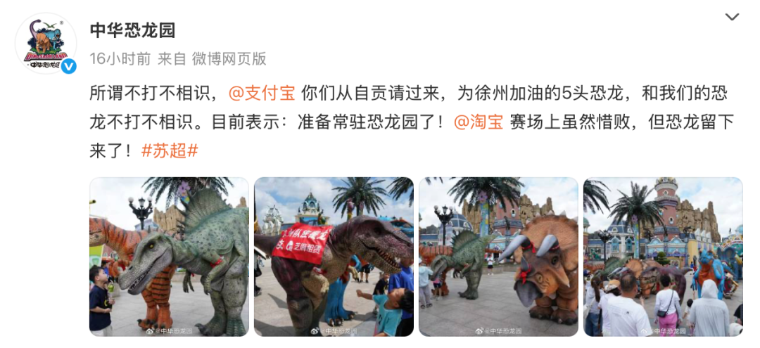 “常徐大戰”之前,淘寶閃購官宣從常州中華恐龍園搖來兩隻恐龍作為常州隊的“足球寶貝”。支付寶也不甘示弱,從四川自貢博物館找來5只恐龍,組成“五福龍”啦啦隊,為徐州應援打call。這支恐龍啦啦隊,頂着高温酷暑,長途跋涉抵達常州。
