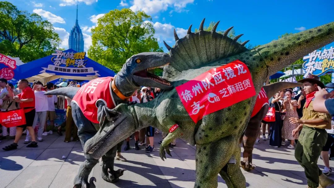 7月20日,當“蘇超”的戰火在賽場內燃燒時,賽場外這5只恐龍正經歷着它們“龍生”中最震撼的一天——