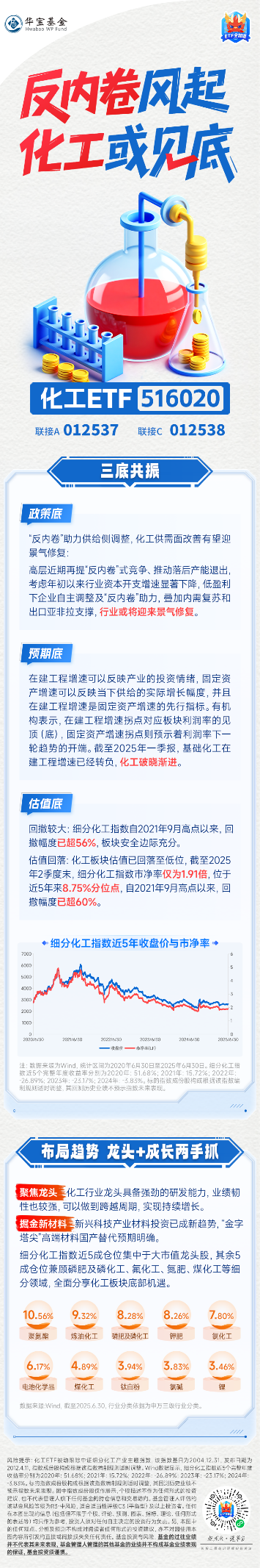綜上,政策強約束加速供給優化,疊加出口擴張與估值低位,化工板塊景氣拐點預期強化。借道化工ETF(516020)一鍵配置龍頭+細分高彈性標的,是高效捕捉行業修復機遇的工具。