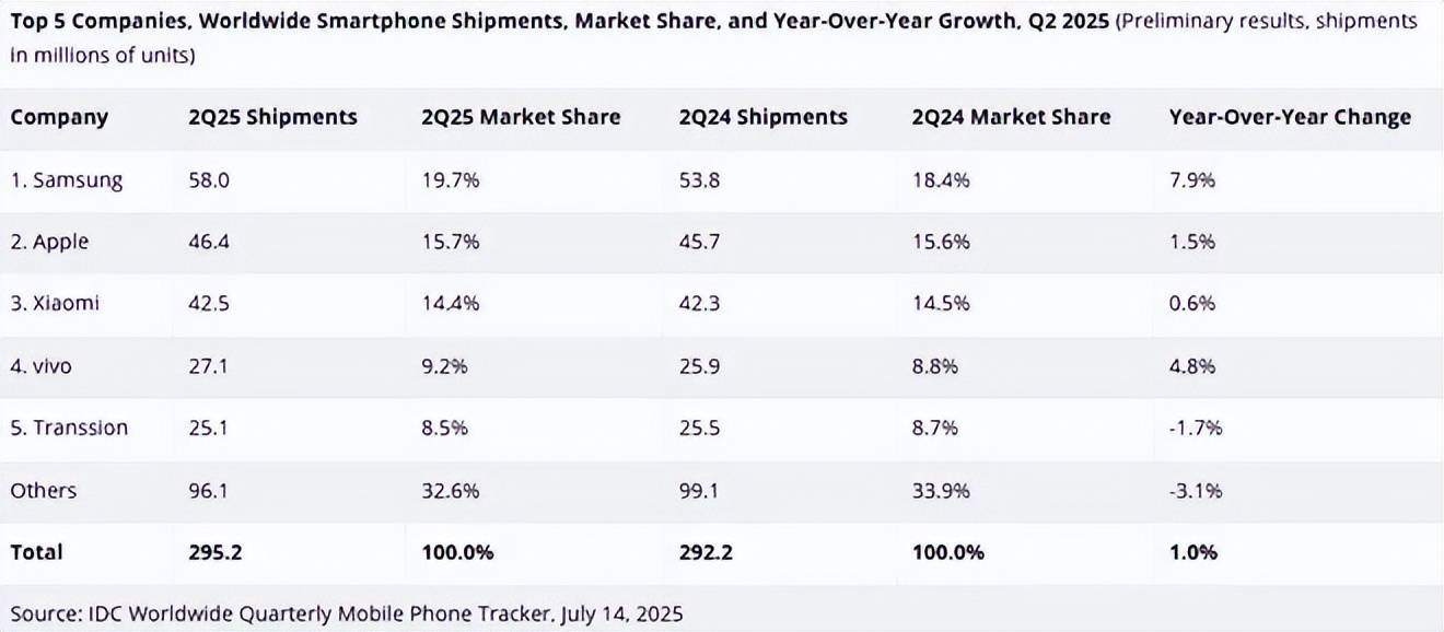 放眼全球手機市場,三星可謂是蘋果的頭號競爭對手。根據IDC調查報告,2025年Q2全球手機總出貨量為2.952億部,同比增長了1%,其中三星出貨量為58億部,位列出貨量榜單首位,隨後的排名依次為蘋果(46.4億部)、小米(42.5億部)、vivo(27.1億部)以及傳音(25.1億部)。
