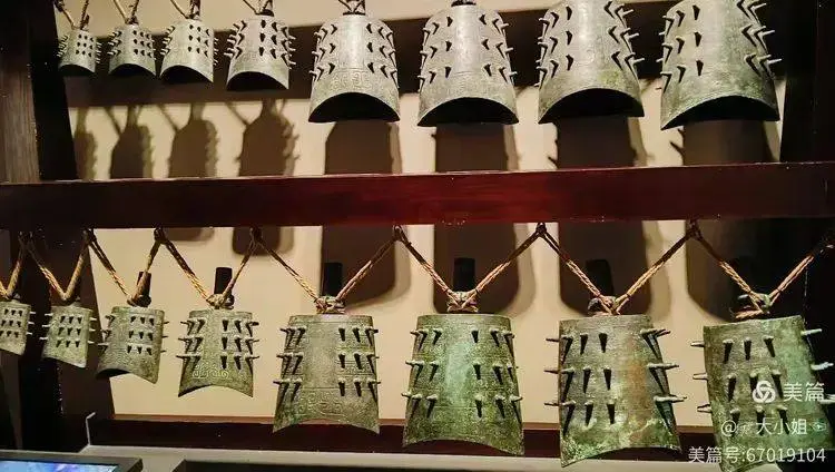 一組編鐘靜靜地陳列在玻璃櫃中。每口鐘大小不一,整齊地懸掛着,彷彿在等待被敲響的那一刻。燈光柔和地灑在它們身上,映出青銅特有的光澤。我想象着,如果有人演奏,那清脆悠揚的樂聲,會不會喚醒沉睡千年的歷史記憶?