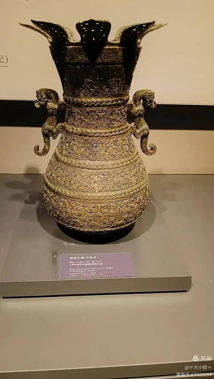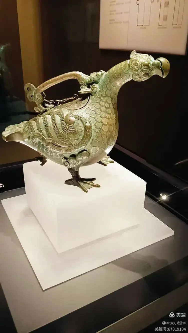 一件青銅器讓我駐足良久——趙卿鳥尊。它以鳳鳥為造型,線條流暢,紋飾精美,展現出春秋時期高超的鑄造工藝。鳥尊的頭部和尾部裝飾繁複,整體古樸典雅,彷彿隨時會展翅高飛。站在它面前,我彷彿能感受到那個時代的貴族氣息與藝術魅力。