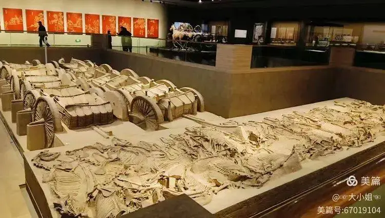 講解員説,這是趙卿墓的車馬坑,是春秋時期晉國貴族墓葬的重要組成部分。站在展示區的欄杆外,我望着坑內排列整齊的15輛車和44匹馬,彷彿穿越回了那個戰車馳騁的時代。雖然眼前的只是複製品,但那種恢宏的氣勢依然讓人震撼。旁邊還掛着一幅紅色壁畫,描繪了古代車馬出行的場景,彷彿在講述一段塵封已久的故事。