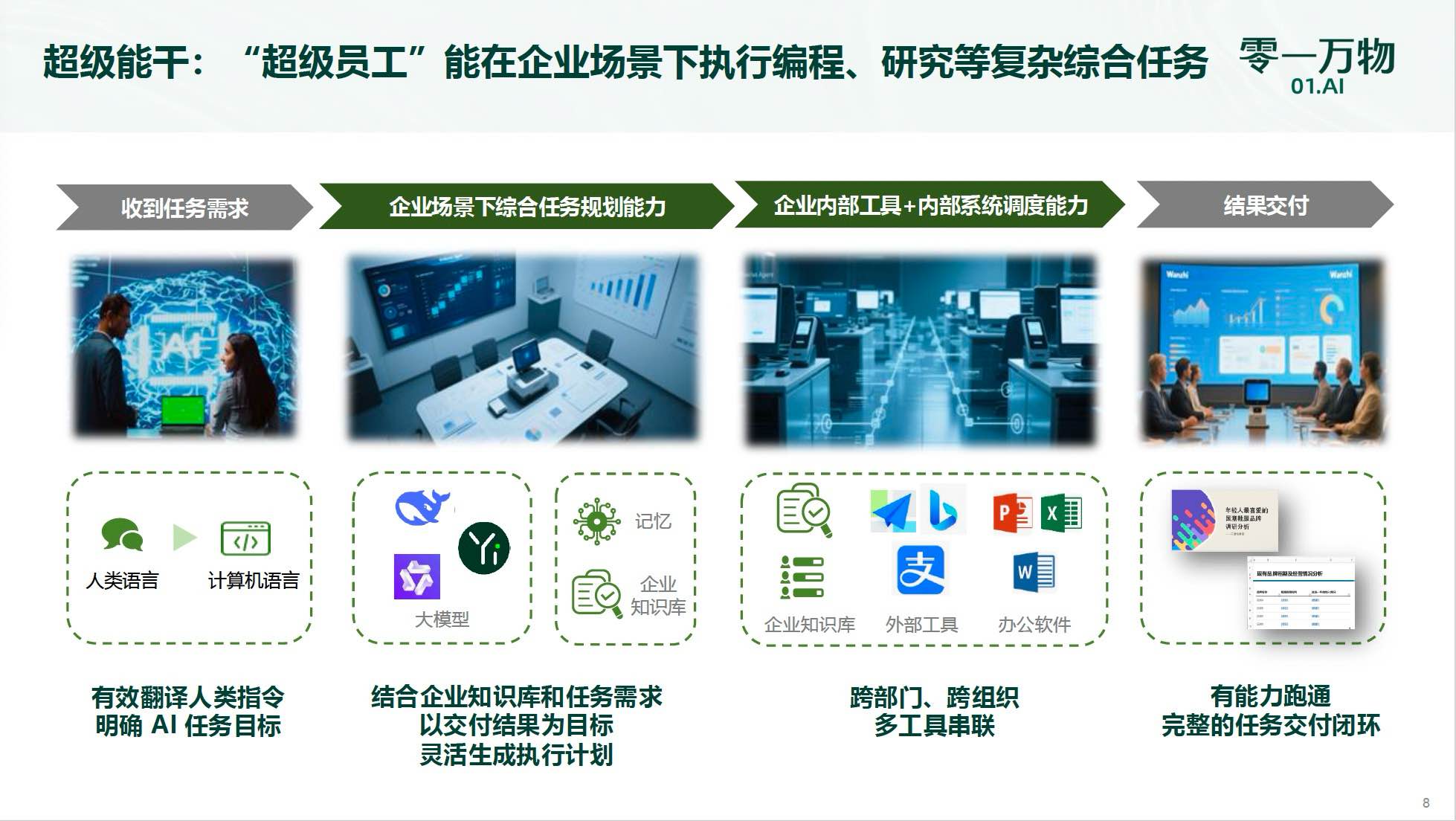 據大力財經瞭解,零一萬物萬智平台的 “超級員工” 已在多個關鍵領域成功落地,引領 Agent 邁入 “價值交付” 時代。在招商領域,萬智招商專家不再侷限於傳統的會議紀要整理與報告輸出,而是以招商目標為導向,藉助多平台搜索整合分析信息,彙總生成客户開發行動建議。不僅如此,它還能依據業務端即時反饋對任務進行優化再處理,並協調內部相關業務條線,直至達成滿意結果。