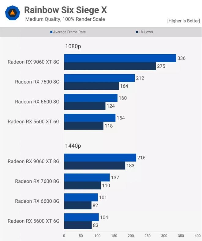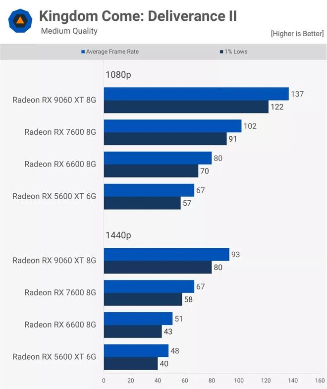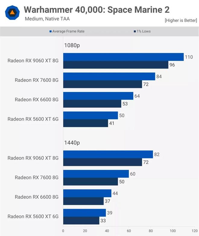 在《戰錘 40K:星際戰士 2》的中等畫質預設下,RX 6600 在 1080p 比 5600 XT 快 28%,1440p 快 13%。RX 7600 比 6600 快 31%-36%,RX 9060 XT 8GB 比 7600 快 31%-37%。與早期遊戲相比,這裏的代際提升更為穩定。