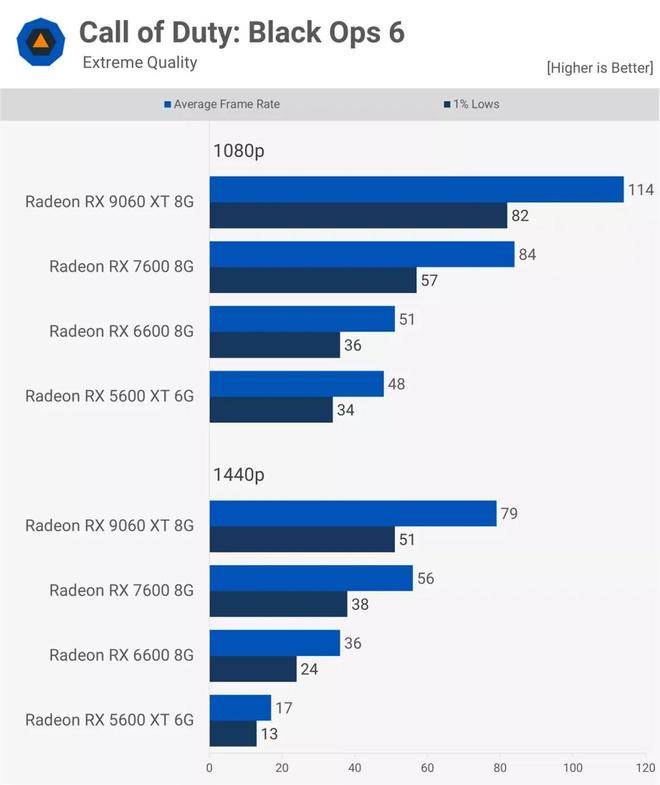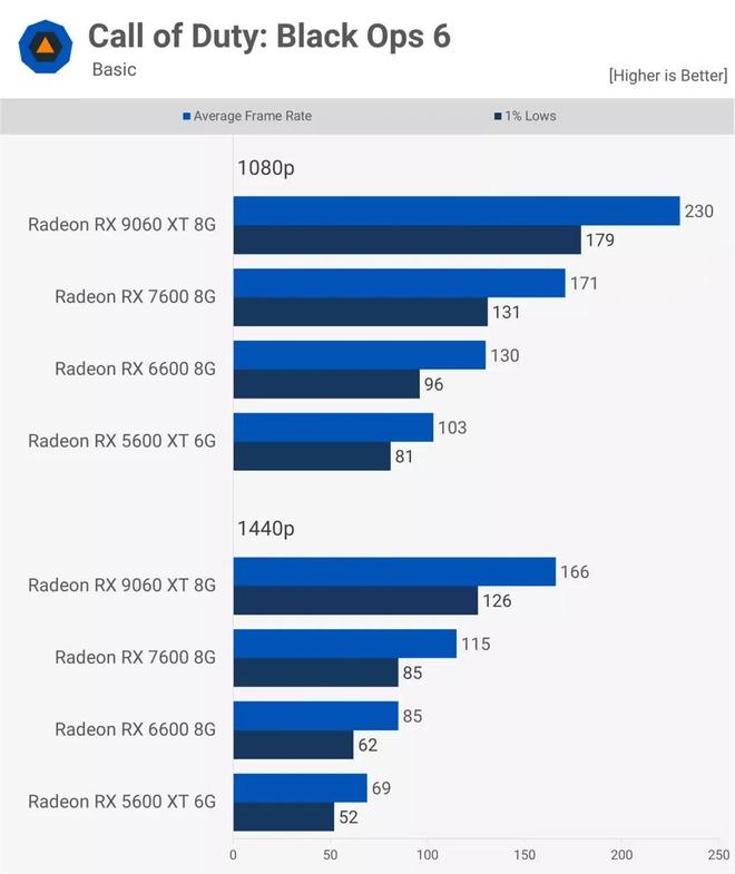 測試《使命召喚:黑色行動 6》時,先採用基礎畫質預設。RX 6600 比 5600 XT 快 23%-26%。RX 7600 比 6600 快 32%-35%。RX 9060 XT 8GB 在 1080p 比 7600 快 35%,1440p 快 44%,顯示仍有性能提升空間。