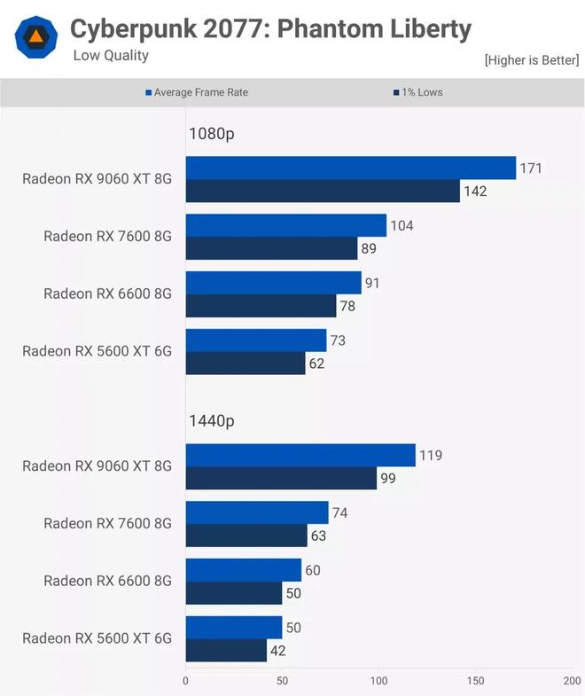 測試《賽博朋克 2077:自由幻象》時,先採用低畫質預設。在此設置下,RX 6600 比 5600 XT 快 20%-25%,RX 7600 在 1080p 下比 6600 快 14%,1440p 下快 23%。但這些都被 RX 9060 XT 8GB 的表現蓋過 —— 它比 RX 7600 性能提升 61%-64%。