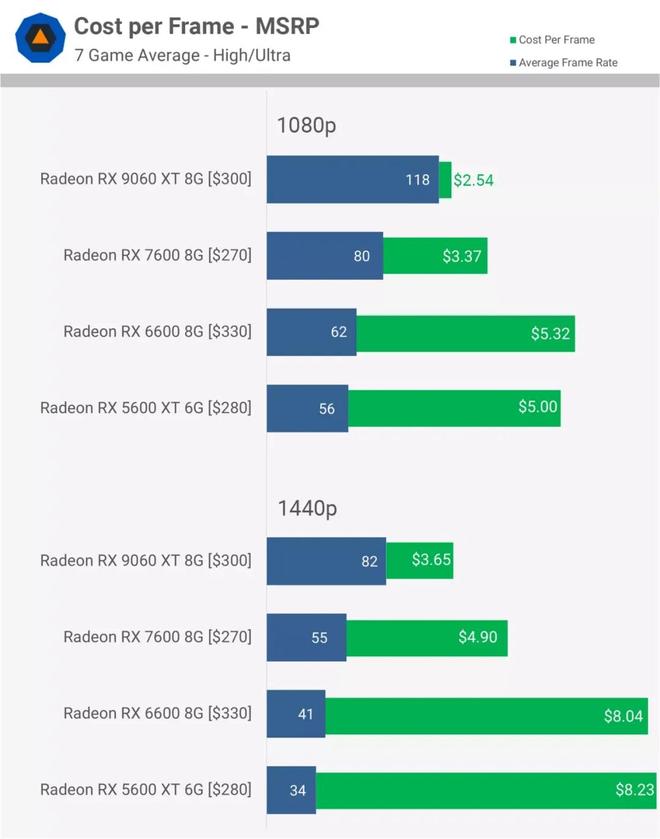 而由於 9060 XT 價格回到 300 美元,其性價比僅比 RX 7600 高近 30%。