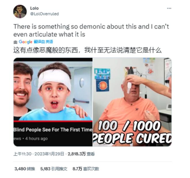 《號外工作室》調查發現,**野獸先生的視頻以“高成本、大製作、鉅額獎金”為標籤,曾因《千盲治癒挑戰》等“慈善內容”引發熱議。**在該視頻中,他為1000名盲人提供免費手術,通過鏡頭記錄患者重見光明的瞬間,搭配高額獎金、夢想實現等戲劇化情節,短時間內收穫海量流量。