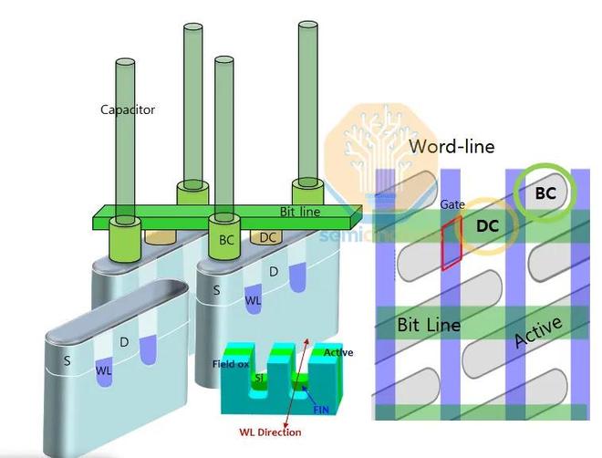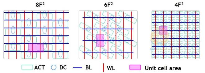 DRAM 單元佈局。ACT = 單元控制晶體管的有源區。DC = 直接接觸,位於位線和晶體管漏極之間。BL = 位線。WL = 字線。來源:三星