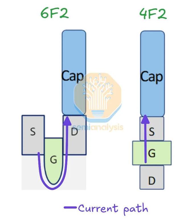 4F2中,電流通過控制晶體管和觸點的路徑更短,電阻更低,因此更多電子能夠進出電池。來源:三星,SemiAnalysis