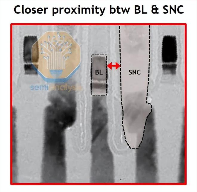 從側面看,很容易看出位線和觸點之間的間隙有多小:
