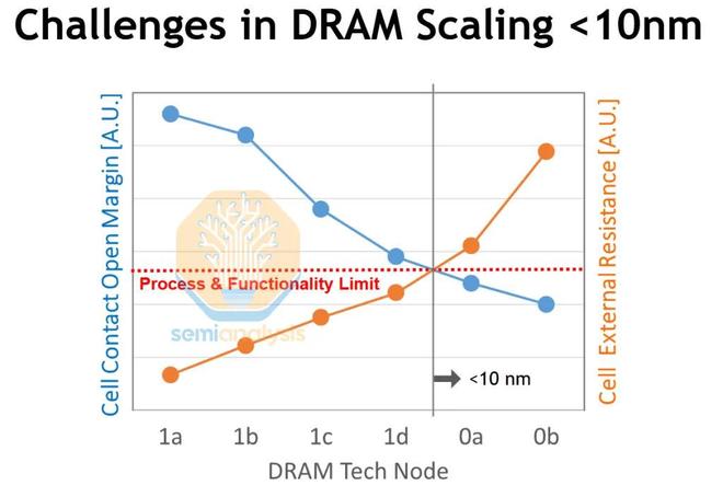 單元接觸面積,尤其是存儲電容器連接到下方控制晶體管的存儲節點接觸面積,會隨着單元臨界尺寸的平方而縮小。這些接觸面積必須足夠大/對準度足夠好,以便在晶體管和電容器之間提供良好的電連接,但又不能過大或錯位,以免與任何相鄰單元短路。這就是上圖中的“單元接觸開口裕度”,它會隨着每個節點的縮小而縮小。在1d時,工藝和工具已達到可行、高良率工藝的極限。