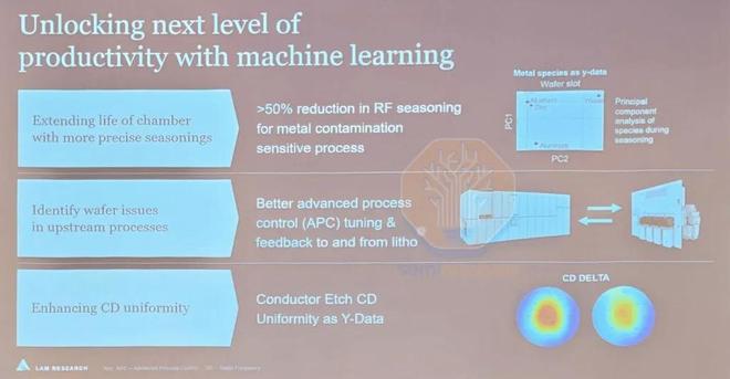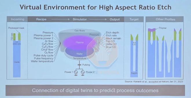 關於利用虛擬硅片進行晶圓級優化,Lam Research 展示了其Coventor SEMulator3D軟件的研究成果。隨着晶體管幾何結構從平面到 FinFET 再到 GAA 的複雜性不斷提升,可能的工藝配方組合數量也呈指數級增長,他們將其稱之為“拉姆定律”。虛擬晶圓製造採用經過優化參數的訓練模型進行工藝仿真,使工程師能夠拓寬工藝窗口、提高良率,同時減少驗證變更所需的物理測試晶圓周期數。Lam Research 還將其沉積和蝕刻工具構建為數字孿生,利用等離子體流模擬構建虛擬腔室,以幫助預測配方,同時優化腔室設計以確保整個晶圓的均勻性。