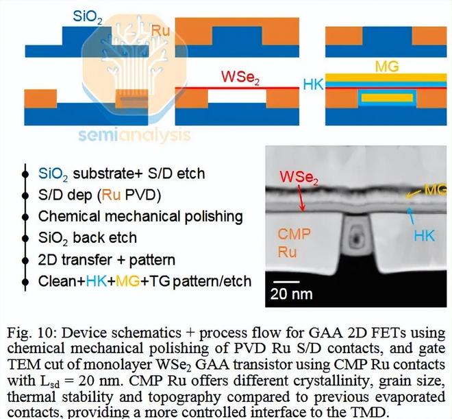 英特爾演示了使用經 CMP 拋光的釕改進的二維晶體管源漏接觸。遺憾的是,該工藝仍然依賴於轉移而非二維材料的生長。來源:英特爾