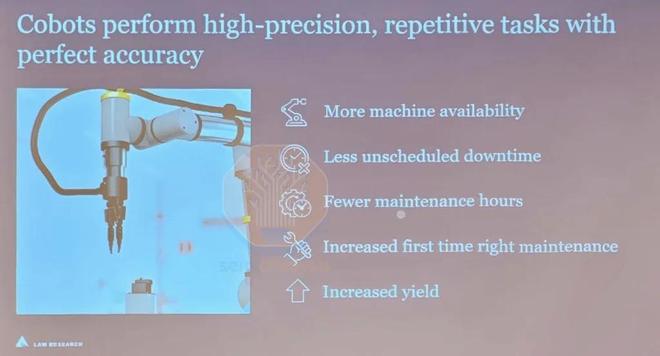 設備維護將通過機器人零件配送以及耗材和易損件的安裝實現自動化,設備的設計也將圍繞機器人維護進行。雖然Lam提出了2035-2040年的概念性目標,但無人值守晶圓廠面臨的主要障礙在於不同供應商設備之間的數據和連接,以及維護流程的標準化。