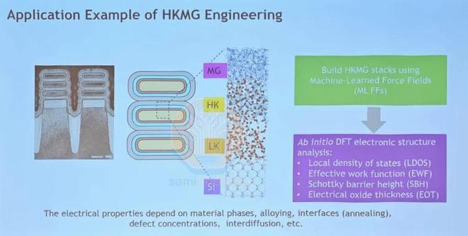 這些原子模型對於理解不同材料層界面處發生的電相互作用至關重要。在接觸工程中,MLFF 用於生成晶體硅和非晶硅化物之間的接觸界面,模擬邊界發生硅化作用的相互擴散深度。然後使用 DFT-NEGF 計算界面上的接觸電阻和電流-電壓曲線。對於柵極氧化層設計,使用 MLFF 構建複雜的多層功函數金屬疊層,並進行模擬以檢查其結構和化學成分。然後可以引入偶極子摻雜物並使用 DFT 進行優化,DFT 還可以進行靜電分析以計算關鍵參數,例如有效功函數、肖特基勢壘高度和等效氧化層厚度。隨着我們逐步推進“全環繞柵極”設計方案,這些原子模擬在選擇合適的材料方面將變得更加重要。