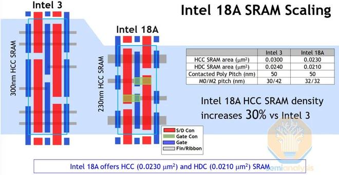英特爾聲稱,相對於英特爾3代基線,18A工藝的SRAM尺寸縮小了30%。從FinFET到GAA的轉換,預計會帶來類似的一次性巨大優勢。單元圖清晰地展示了用單層寬帶取代兩層鰭片後實現的尺寸縮小: