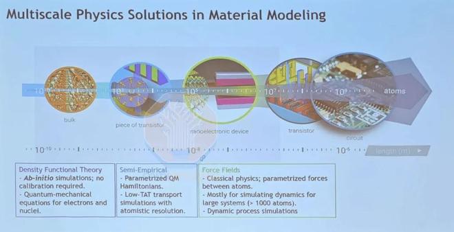 在原子模擬方面,新思科技概述了其QuantumATK套件,該套件用於材料工程中的晶體管觸點和柵極氧化物堆疊設計,這些設計對器件性能至關重要。傳統的密度泛函理論 (DFT) 建模原子間的量子效應最精確,但計算成本高昂;而傳統的牛頓原子相互作用的力場模擬速度快,但精度有限。GPU 加速的 DFT-NEGF(非平衡格林函數)僅使用 4 倍 A100 即可實現 9.3 倍加速(相對於 CPU);而使用矩張量勢的機器學習力場模擬則展現了接近 DFT 的精度,計算成本為 17 分鐘,而傳統 DFT 則需要 12 天。