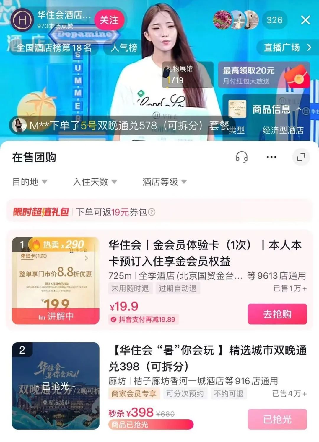 這不前兩天才看到華住會在上海虹橋機場、高鐵站大屏打廣告。最近刷抖音,又看到它家官方直播間各種團購通兑日曆房、黃金會員體驗卡等促銷產品賣得風生水起。