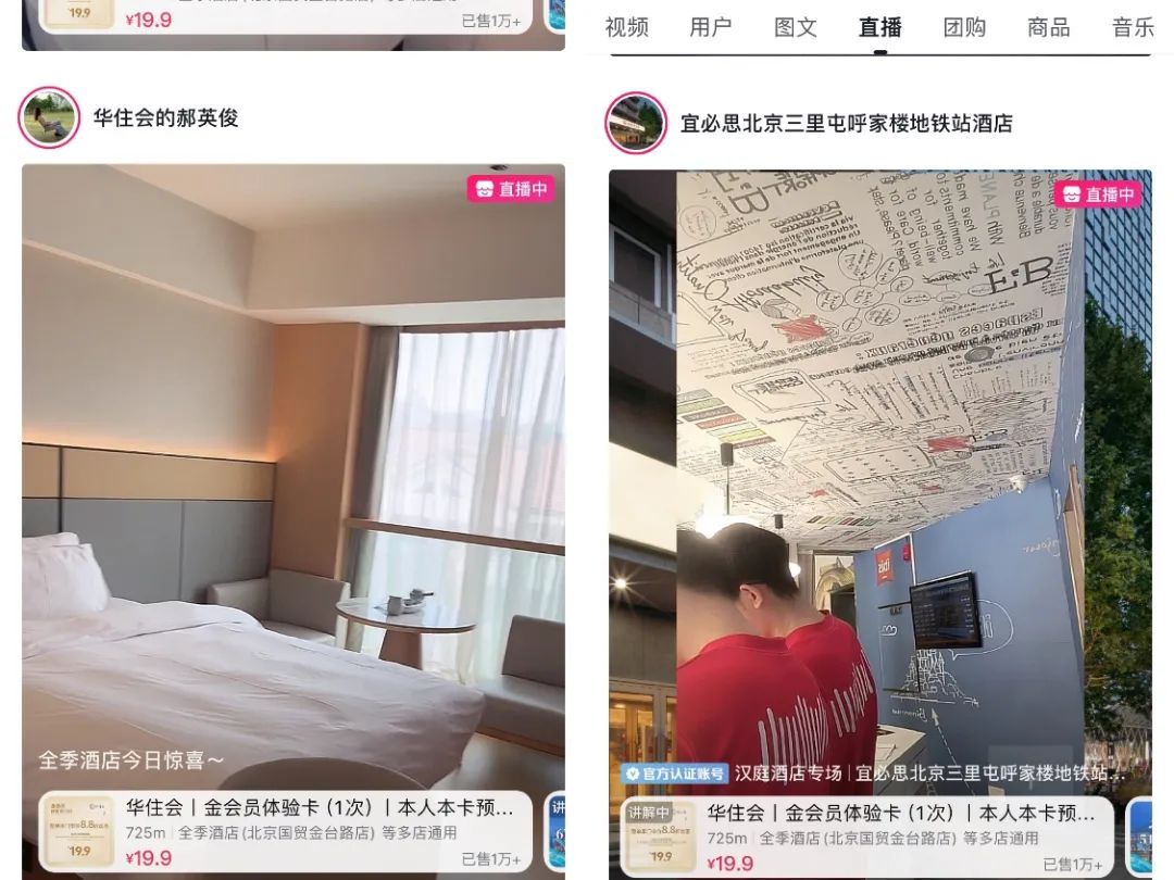我特意在抖音搜了下,一些大家出門經常會住到的酒店品牌比如首旅如家、錦江、亞朵這些連鎖品牌,還有像凱悦、希爾頓這樣的國際酒店在華品牌,也都有不同類型優惠產品在熱銷。