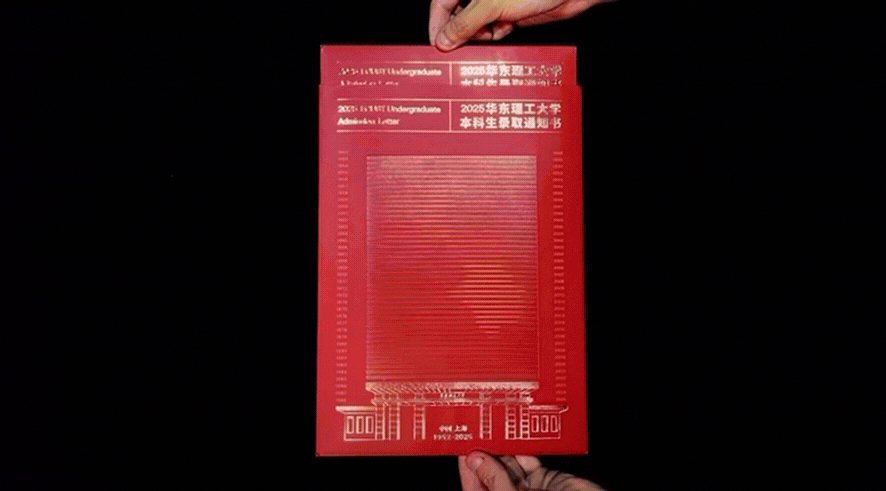 華東理工大學2025年的本科錄取通知設計上,外冊與內頁顏色整體為紅色,同樣採用的是抽動格柵設計,上下抽動外冊,內頁會出現葉子紛飛的圖案,外冊格柵兩側排列着1952到2025的年份字樣,其中1952年為華東理工大學的建校年份。