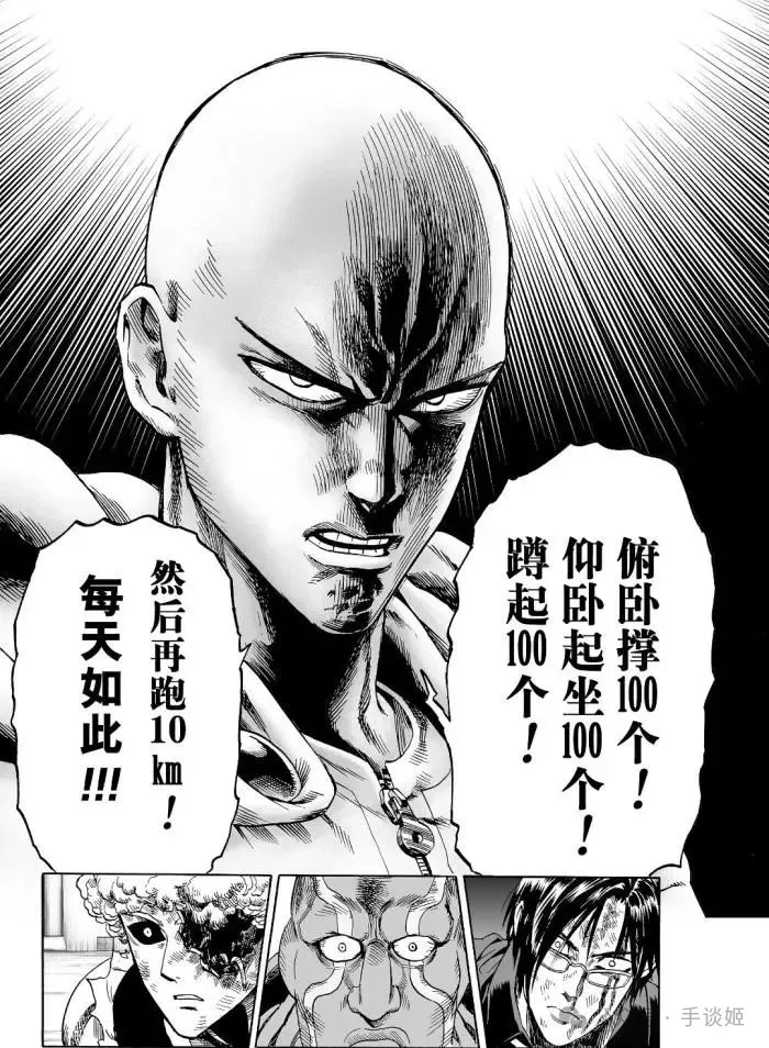 當被其他角色問起為何能這麼強時,埼玉表示秘籍就是堅持鍛鍊——每天完成100個俯卧撐、100個仰卧起坐、100個深蹲外加10公里長跑。如此3年後,“神功”大成。