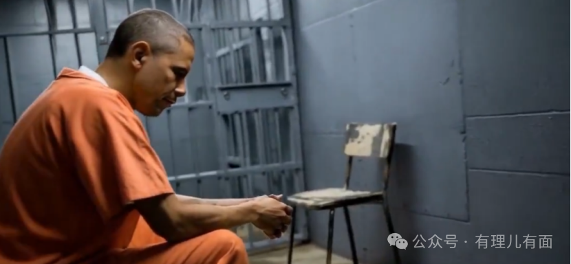 視頻最後畫面切至監獄:奧巴馬身着橘色連體囚服,雙手抓住鐵欄杆。