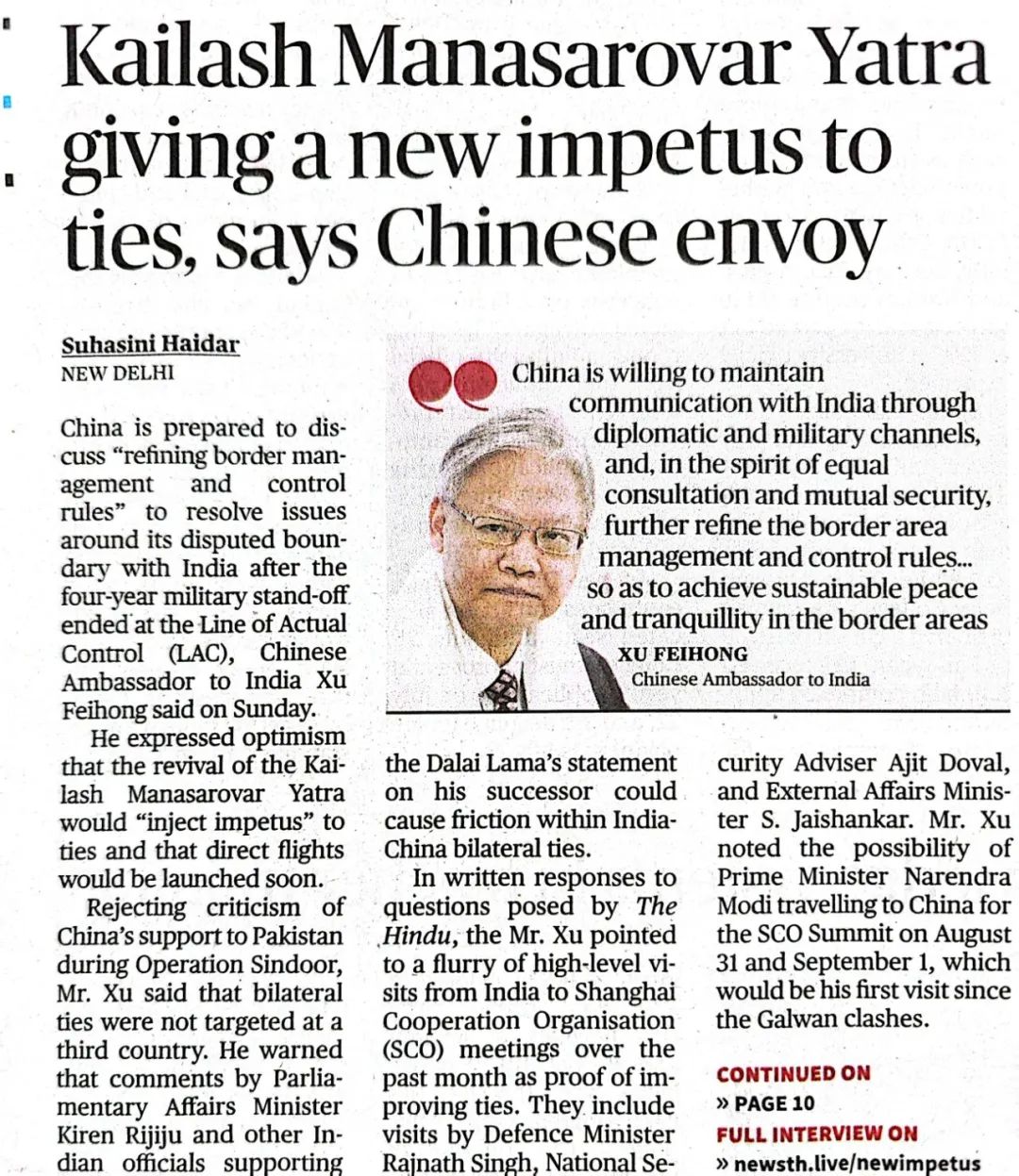 2025年7月21日,印度主流英文大報《印度教徒報》刊登對徐飛洪大使的書面採訪。徐大使介紹了中印高層交往、人文交流、經貿合作和中國的南亞外交政策等。全文如下: