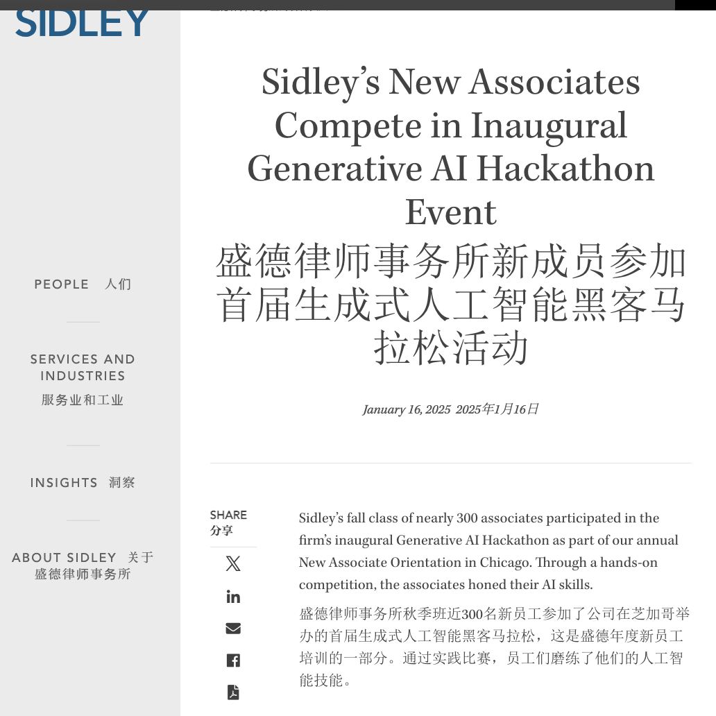 盛德(Sidley Austin)直接在新員工入職培訓裏,搞了一場300人的AI駭客馬拉松(hackathon)。