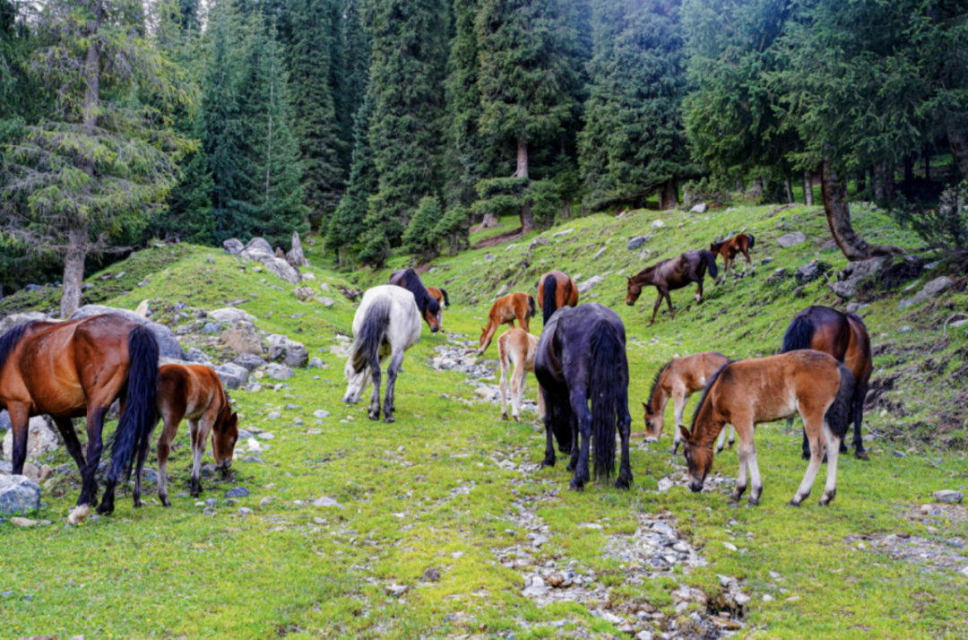 夏季這裏會舉辦我們哈薩克族的傳統體育賽事,比如姑娘追、賽馬、摔跤,牛羊在山坡上吃草,孩子們在空地上追逐,笑聲被風帶到雲杉林深處。