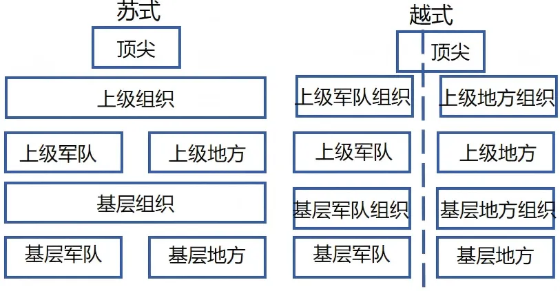而且,越式和蘇式還有一個差別,請看最上一層,蘇式制度裏整個頂層都能通過組織影響到軍隊。