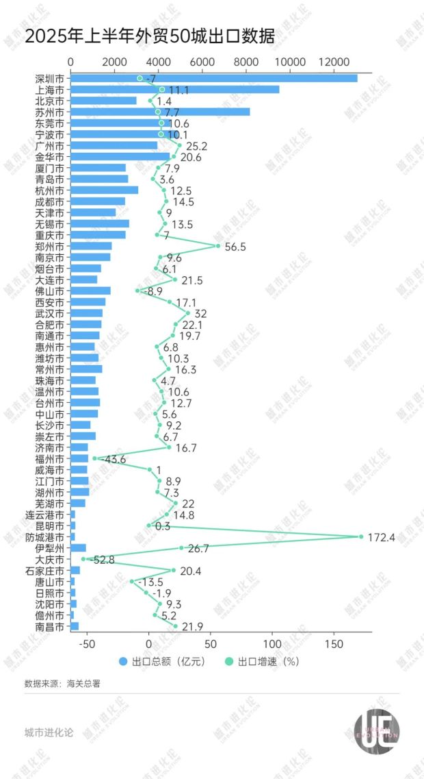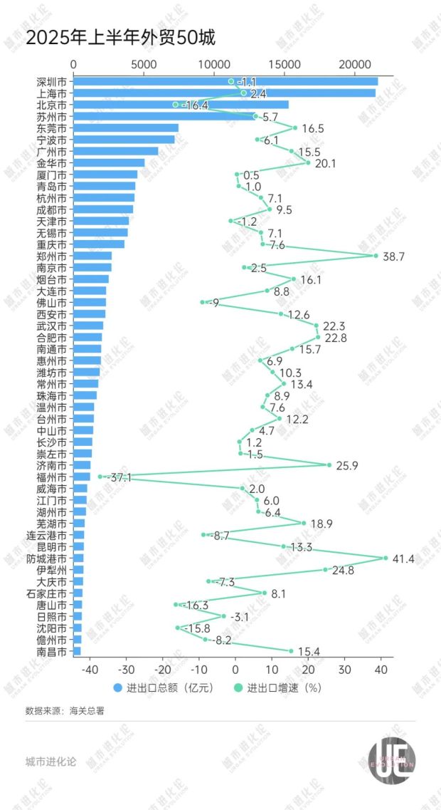 近日,海關總署公佈今年上半年主要外貿城市進出口數據,深圳、上海、北京、蘇州、東莞等外貿50強城市進出口總額達17.57萬億元,直接貢獻全國外貿的八成份額,堪稱中國外貿的底盤。