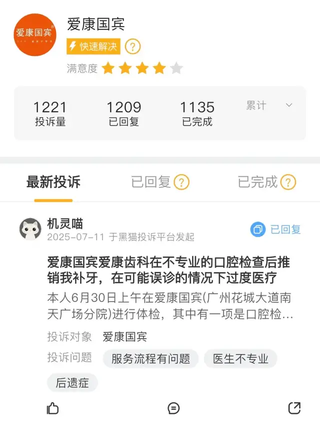 2024年11月11日,消費者投訴稱,“在愛康國賓參加的單位體檢,當時檢查有實性肺結節4mm,今天我到江蘇省中西醫結合醫院檢查CT一切正常,根本就沒有所謂的結節,真是拿人健康開玩笑。”